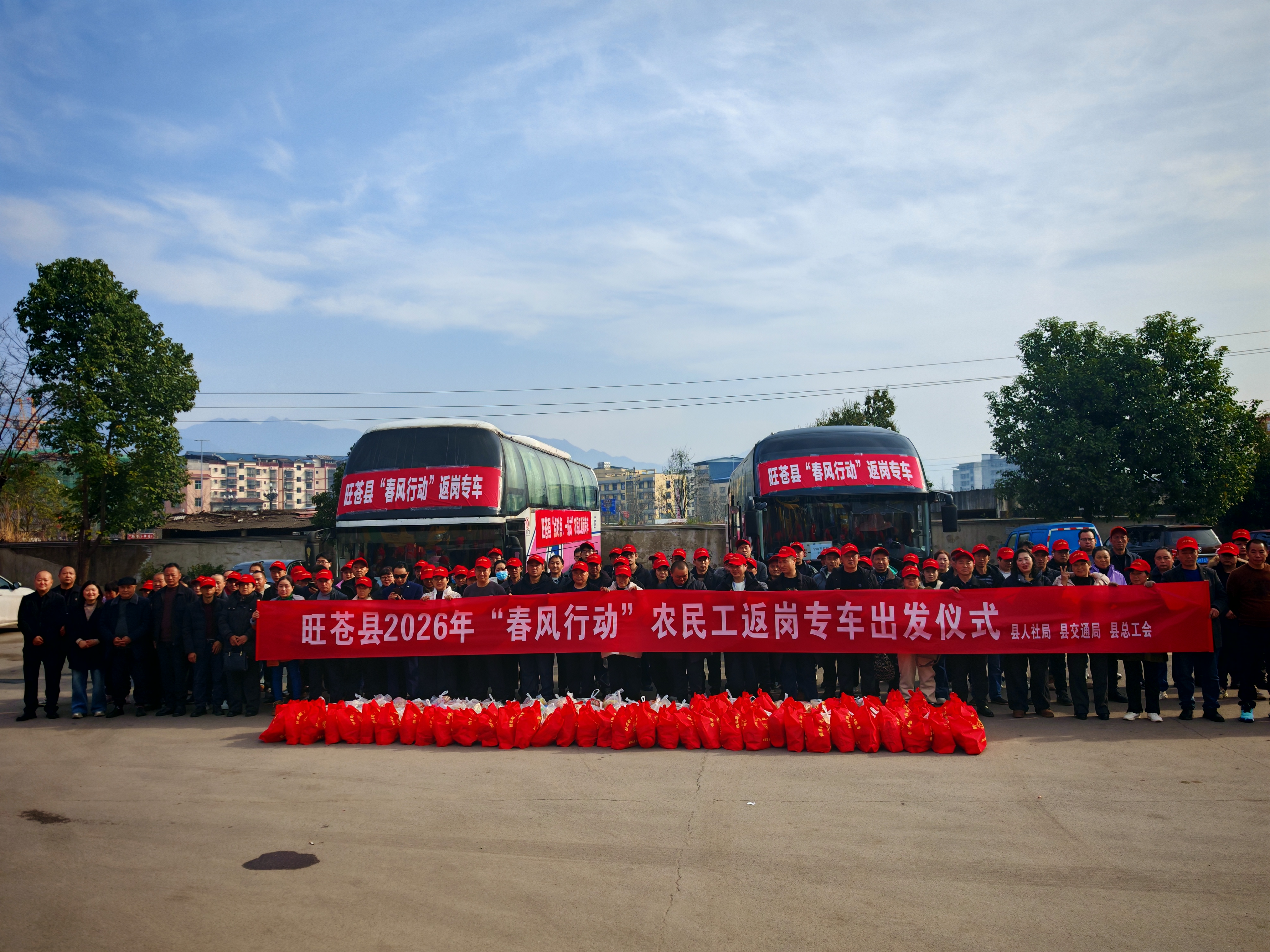 这是旺苍县2026年春节后发出的首批农民工返岗专车,标志着我县“春风行动”进入集中推进阶段,让务工人员实现“家门到车门、车门到厂门”的无缝衔接。