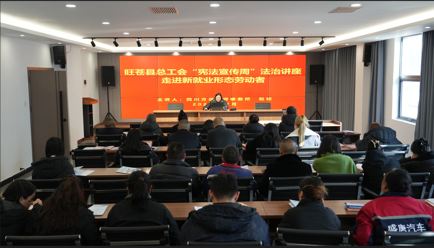 为进一步提升广大职工特别是新就业形态劳动者的法律素养和维权能力,第十二个“宪法宣传周”期间,旺苍县总工会于12月5日深入四川华运汽车制造有限公司,举办了一场以“尊崇宪法、维护权益、促进和谐”为主题的专场法治讲座,将法律知识和服务送到了一线职工身边。