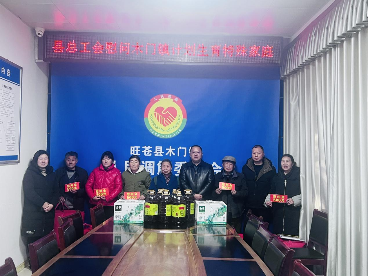 在春节来临之际,为加强对计生特殊家庭的关怀,1月7日,旺苍县总工会党组书记、常务副主席陈保全带队,前往木门镇走访慰问7户计生特殊家庭,为他们送去棉被、食用油、牛奶等慰问品,并向每户发放500元慰问金。