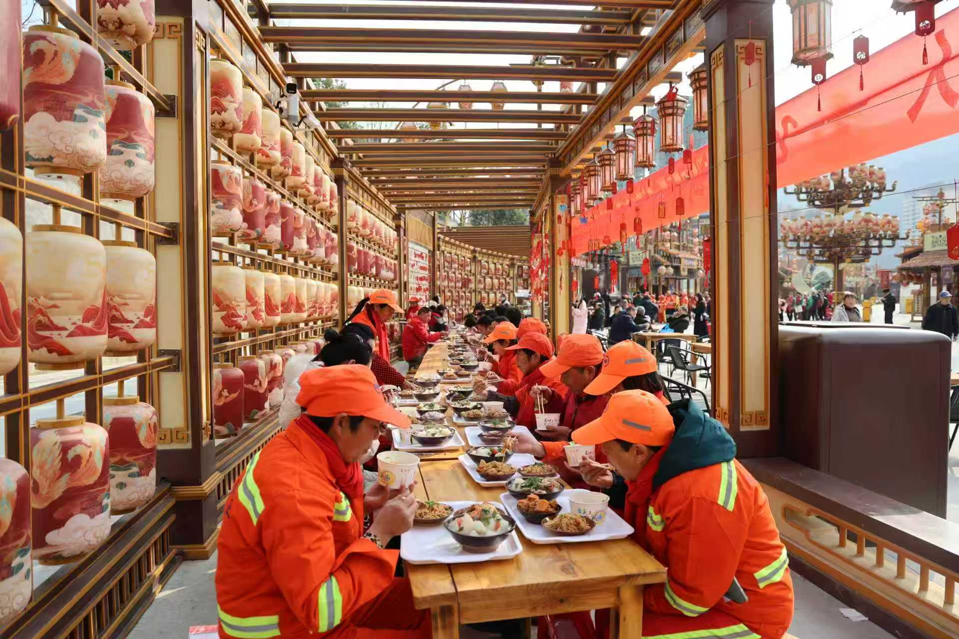中午时分,热气腾腾的爱心庖汤宴准时开席,工作人员全程引导有序就餐、提供贴心服务,全力保障户外劳动者吃得舒心、吃得放心。用餐结束后,户外劳动者还参观了大蜀道不夜三国城街区,自主选购乡村振兴农产品展销区的优质好物,活动在温馨氛围中圆满落幕。