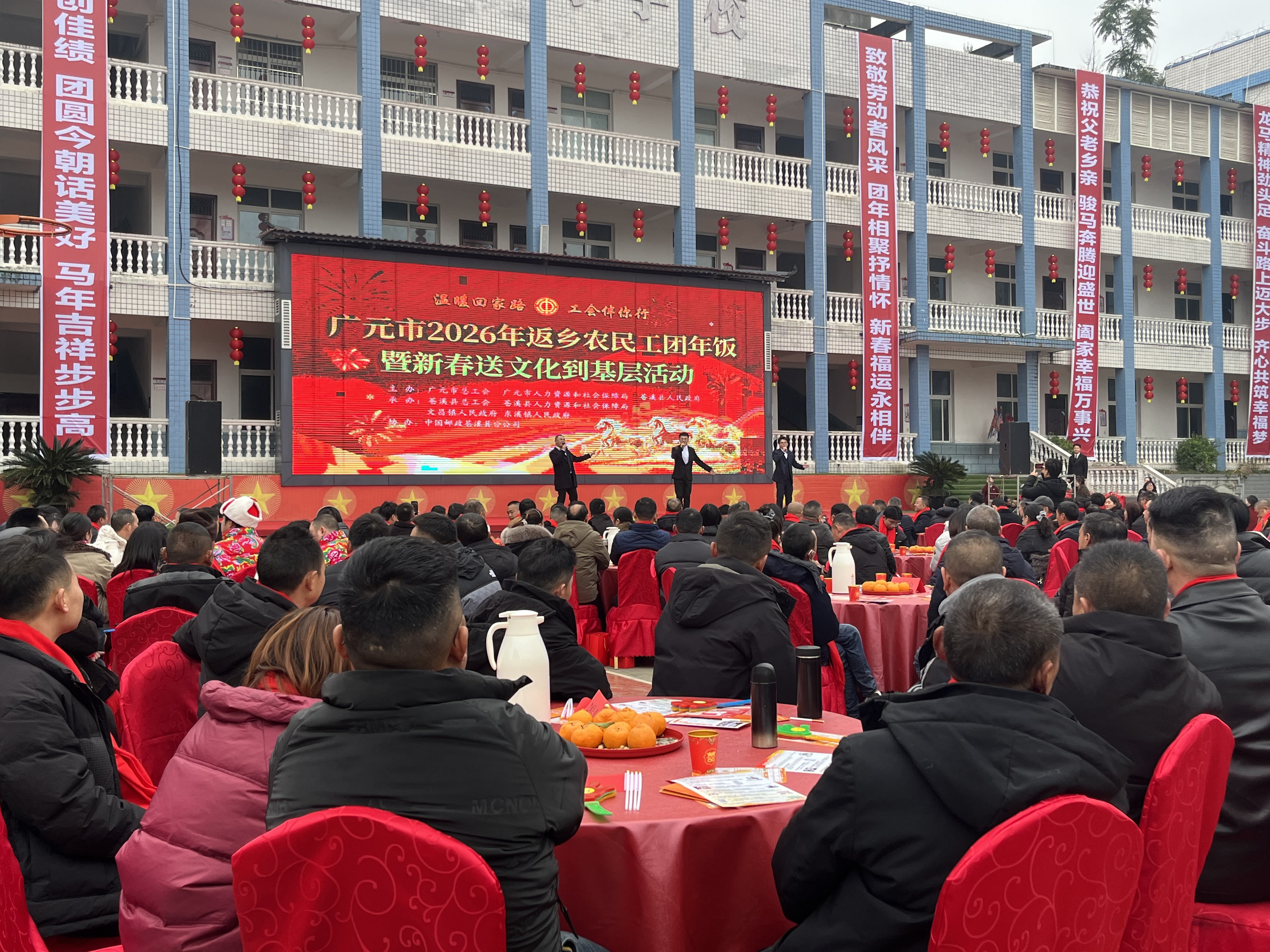 新春启序,暖意相伴。2月12日,广元市“温暖回家路·工会伴你行”返乡农民工团年饭暨“送福进万家·文化下基层”迎新春慰问演出活动,在苍溪县文昌镇小学校温情启幕、圆满落幕。省总工会保障部部长庞欣,市人社局党组成员、市就业创业促进中心主任李坪,市总工会党组成员、副主席沈杨波,县委常委、宣传部部长、县总工会主席王泽,县人民政府副县长母建容出席活动,与近400名返乡农民工代表、演职及保障人员欢聚一堂,共品家乡味、共叙桑梓情、共迎新春佳节。