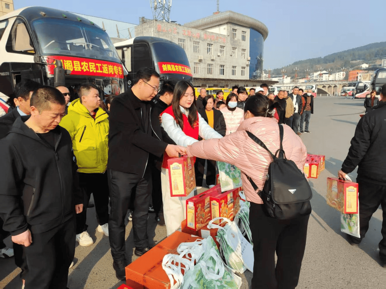 欢送仪式上,剑阁县农民工服务中心向务工人员送上新春祝福,叮嘱大家途中注意安全、遵守规范,在外团结互助、遵纪守法、勤学本领,展现剑阁人民勤劳质朴的优良风貌。剑阁县人社、工会、妇联及广运集团剑阁分公司等为返岗人员发放面包、坚果、饮品等爱心礼包,同步送上政策宣传手册,细致讲解就业扶持、权益维护、社保办理等内容,以贴心服务传递政府温暖。