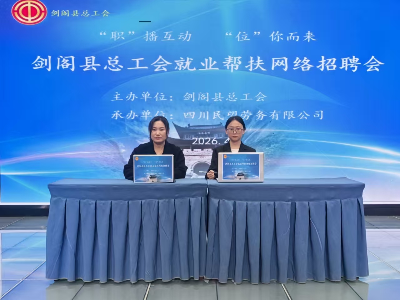 为深入贯彻落实就业优先战略,切实发挥工会组织桥梁纽带作用,精准对接企业用工需求与劳动者就业诉求,2026年4月3日,由剑阁县总工会主办、四川民望劳务有限公司承办的“‘职’播互动 ‘位’你而来”就业帮扶网络招聘会圆满举办。本次活动通过工会就业帮扶云平台、剑阁融媒APP同步直播,打破时空限制,搭建起高效便捷的云端就业对接桥梁。